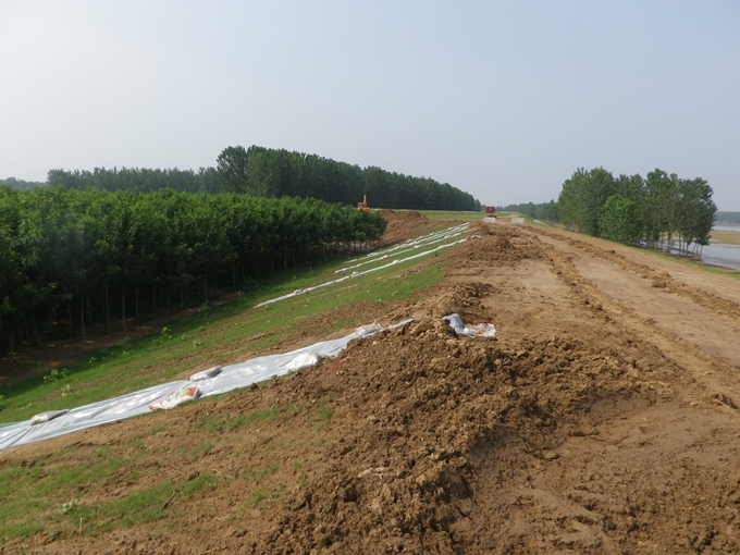 李玉強(qiáng)一行沿著淮干項(xiàng)目部施工Ⅲ標(biāo)段剛完工的新建堤防、老堤加固堤頂邊走邊看,詳細(xì)聽取了淮干項(xiàng)目副經(jīng)理關(guān)于施工標(biāo)段目前的防汛工作情況的匯報(bào)。李玉強(qiáng)表示新建成的堤防工程是蚌浮段臨北處今年防汛工作的關(guān)鍵,對(duì)該標(biāo)段堤防邊坡雨淋溝防護(hù)措施表示贊賞,并要求在蚌浮段方臨處各參建單位中推廣。堤防工程土壤砂性大,修復(fù)工作繁重,李玉強(qiáng)囑咐該標(biāo)段在面臨今年可能出現(xiàn)大洪水的情況下,思想上要保持高度重視,并在人力、物力、財(cái)力上給予充足支持,確保堤防工程的安全。